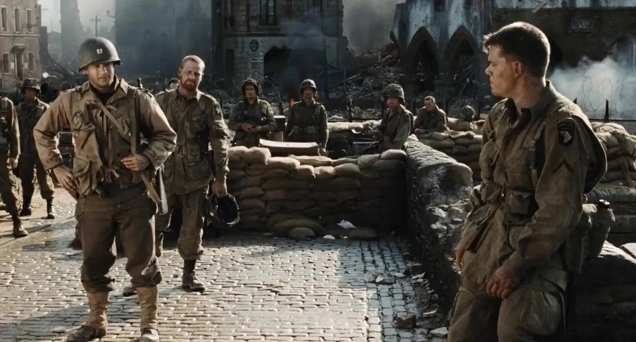 Cast: Tom Hanks as Captain John H. Miller, Tom Sizemore as Technical Sergeant Michael Horvath, Edward Burns as Private Richard Reiben, Matt Damon as Private James Francis Ryan, Barry Pepper as Private Daniel Jackson, Adam Goldberg as Private Stanley Mellish, Vin Diesel as Private Adrian Caparzo, Giovanni Ribisi as T-Medic Irwin Wade, Ted Danson as Captain Fred Hamill, Jeremy Davies as Corporal Timothy Upham, Paul Giamatti as Sergeant William Hill, Dennis Farina as Lieutenant Colonel Walter Anderson, Joerg Stadler as Steamboat Willie, Max Martini as Corporal Henderson, Dylan Bruno as Toynbe, Daniel Cerqueira as Weller, Demetri Goritsas as Parker, Ian Porter as Trask, Gary Sefton as Rice, Julian Spencer as Garrity, Steve Griffin as Wilson, William Marsh as Lyle, Marc Cass as Fallon, Markus Napier as Major Hoess, Neil Finnighan as Ramelle Paratrooper, Peter Miles as Ramelle Paratrooper, Paul Garcia as Field HQ Major, Seamus McQuade as Field HQ Aide, Ronald Longridge as Coxswain, Adam Shaw as Delancey, Rolf Saxon as Lieutenant Briggs, Corey Johnson as Radioman, Loclann Aiken as Soldier on the Beach, John Barnett as Soldier on the Beach, Maclean Burke as Soldier on the Beach, Victor Burke as Soldier on the Beach, Aiden Condron as Soldier on the Beach, Paschal Friel as Soldier on the Beach, Shane Hagan as Soldier on the Beach, Paul Hickey as Soldier on the Beach, Shane Johnson as Soldier on the Beach, Laird Macintosh as Soldier on the Beach, Brian Maynard as Soldier on the Beach, Martin McDougall as Soldier on the Beach, Mark Phillips as Soldier on the Beach, Lee Aaron Rosen as Soldier on the Beach, Andrew Scott as Soldier on the Beach, Matthew Sharp as Soldier on the Beach, Vincent Walsh as Soldier on the Beach, Grahame Wood as Soldier on the Beach, John Sharian as Corporal, Glenn Wrage as Doyle, Crofton Hardester as Senior Medical Officer, Martin Hub as Czech Wehrmacht Soldier, Raffaello Degruttola as Goldman, Nigel Whitmey as Private Boyd, Sam Ellis as Private Hastings, Erich Redman as German #1, Tilo Keiner as German #2, Stephan Grothgar as German #3 / Voice on Bullhorn, Stephane Cornicard as Jean, Michelle Evans as Jean's Wife, Martin Beaton as Jean's Son, Anna Maguire as Jean's Daughter, Nathan Fillion as Minnesota Ryan, Leland Orser as Lieutenant DeWindt, Michael Mantas as Paratrooper Lieutenant, David Vegh as Paratrooper Oliver, Ryan Hurst as Paratrooper Mandelsohn, Nick Brooks as Paratrooper Joe, Sam Scudder as Paratrooper #1, John Walters as Old French Man, Dorothy Grumbar as Old French Woman, James Innes-Smith as MP Lieutenant, Harve Presnell as General Marshall, Dale Dye as War Department Colonel, Bryan Cranston as War Department Colonel, David Wohl as War Department Captain, Eric Loren as War Department Lieutenant, Valerie Colgan as War Department Clerk, Amanda Boxer as Mrs. Margaret Ryan, Harrison Young as Ryan as Old Man, Kathleen Byron as Old Mrs. Ryan, Rob Freeman as Ryan's Son, Thomas Gizbert as Ryan's Grandson, Nina Muschallik as Ryan's Granddaughter (uncredited), Taylor Murphy as Sergeant Blaine (uncredited), Mac Steinmeier as Waffen SS Soldier (uncredited), Derek Lea as Bangalore Assistant (uncredited), Leo Stransky as German Sniper (uncredited), Vincent Ventresca as Soldier on Beach (uncredited)